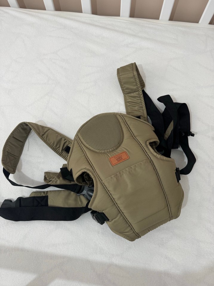 Yastıklı askıları ve nefes alabilir file paneliyle kahverengi ve gri bebek taşıyıcı. Ayarlanabilir tasarımı güvenli oturuş sağlar.