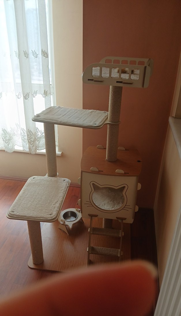 Yumuşak platformlar, rahat kapalı alan ve tırmanma merdiveni bulunan kahverengi ve gri çok katlı kedi tırmalama ve oyun evi.