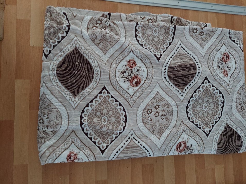 Kahverengi ve gri renklerde, çiçekli ve geometrik desenlere sahip geleneksel koltuk örtüsü. ️battaniye olarak kullanılabilir