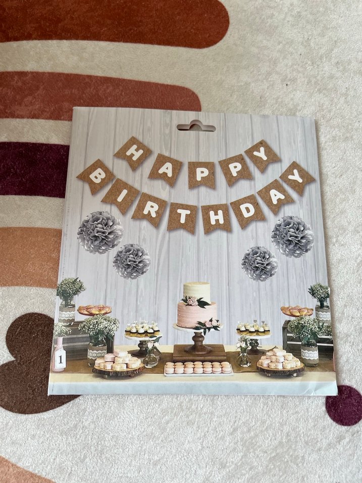 Kahverengi 'Happy Birthday' yazılı pankart ve gri süs toplarından oluşan doğum günü parti seti.