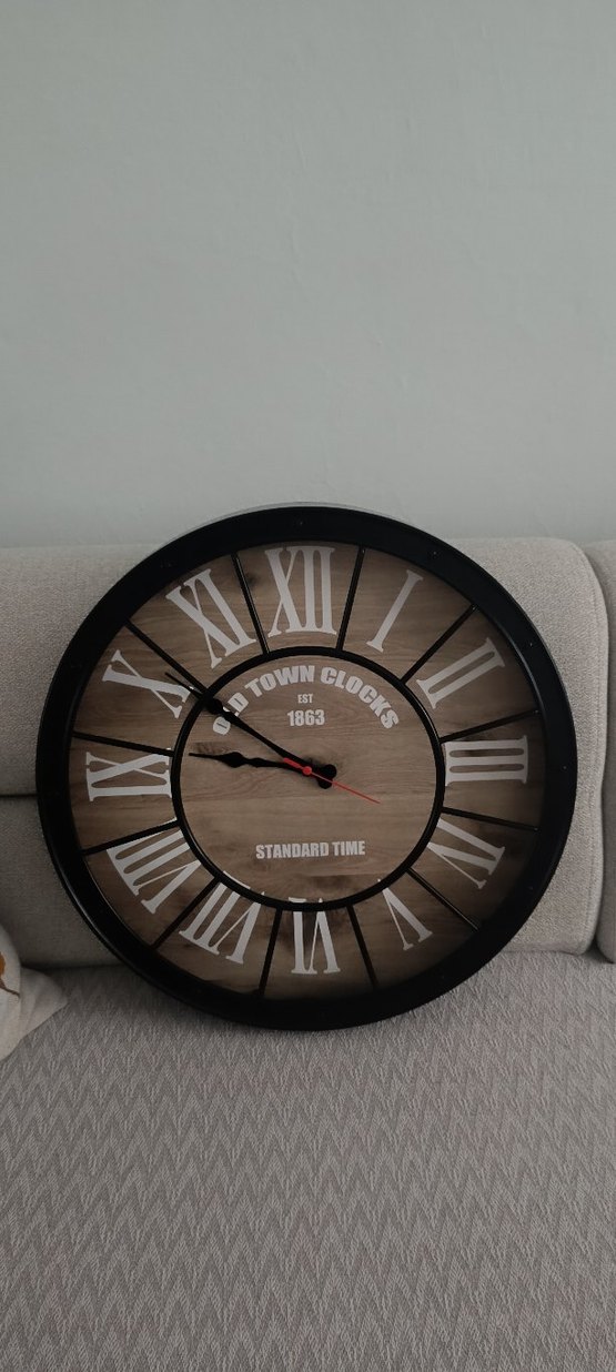 Kahverengi ve gri tonlarda, Roma rakamlı ve "1863", "STANDARD TIME" ile "IST" yazılı duvar saati. ️