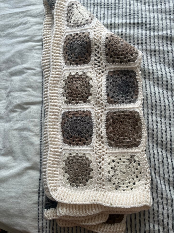Kahverengi ve gri karelerden oluşan el örgüsü krem çerçeveli hırka, sıcak ve rahat bir görünüm sunar.