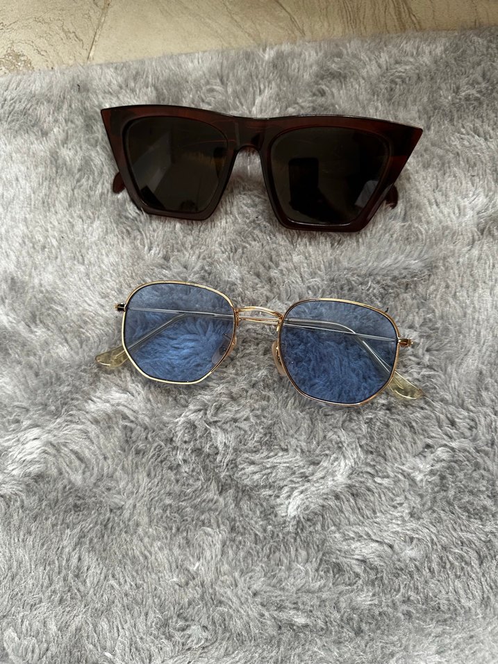 Kahverengi kedi gözü güneş gözlüğü ve gri camlı, tüylü detaylı altın çerçeveli gözlükten oluşan bohem ve retro tarzda set. ️ikisi 250 tl tek fiyat 150 mavi olanda hafif soyulma var ama çok belli değil