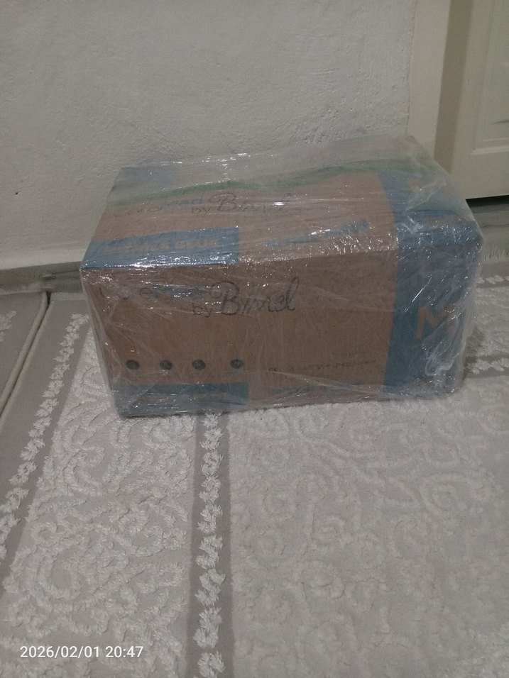 Kahverengi ve gri renkte dayanıklı karton kutu, koruyucu plastikle sarılmış. Kutunun bir tarafında yazılar ve delikler bulunur. ️