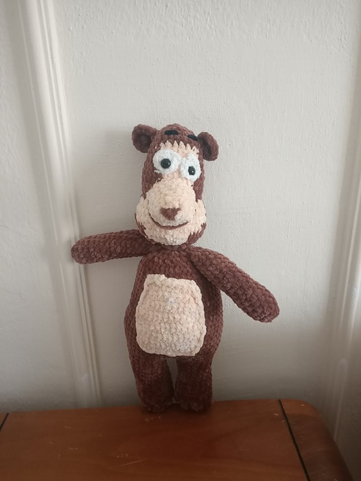 Kahverengi ve somon tonlarında, yumuşak dokulu peluş ayıcık oyuncak. Detaylı yüz ifadesiyle samimi bir görünüm sağlar. Çizgi film karakteri Masha ve Koca ayı dan esinlenilmiş Koca ayı amigurumi oyuncak