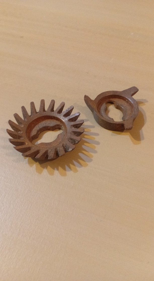 Kahverengi ve gri renklerde, ahşap makinası bıçakları dairesel parçadan oluşuyor