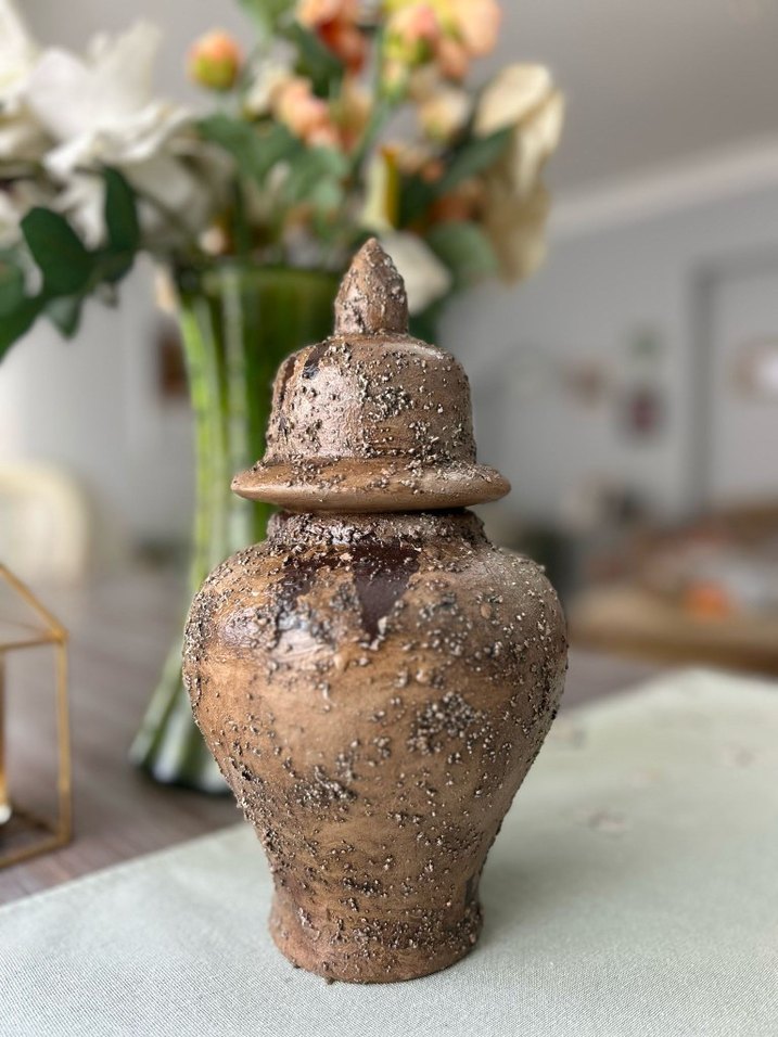 Kabartmalı yüzeye ve kapağa sahip kahverengi ve gri seramik vazo, rustik ve sanatsal bir tasarıma sahiptir.