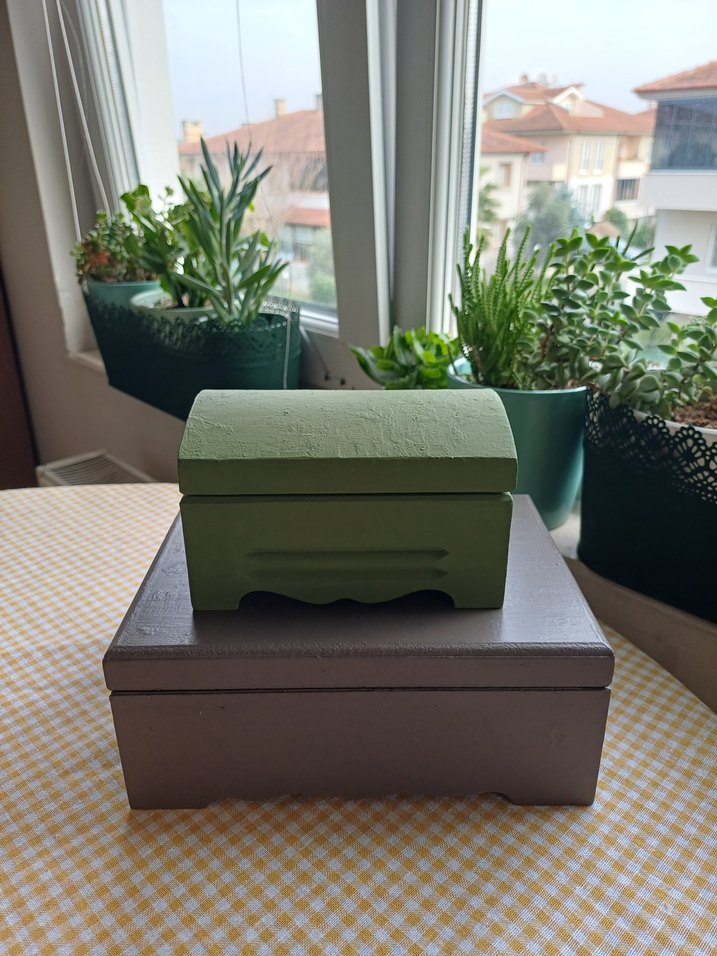 Kahverengi ve haki renkte iki ahşap kutu.