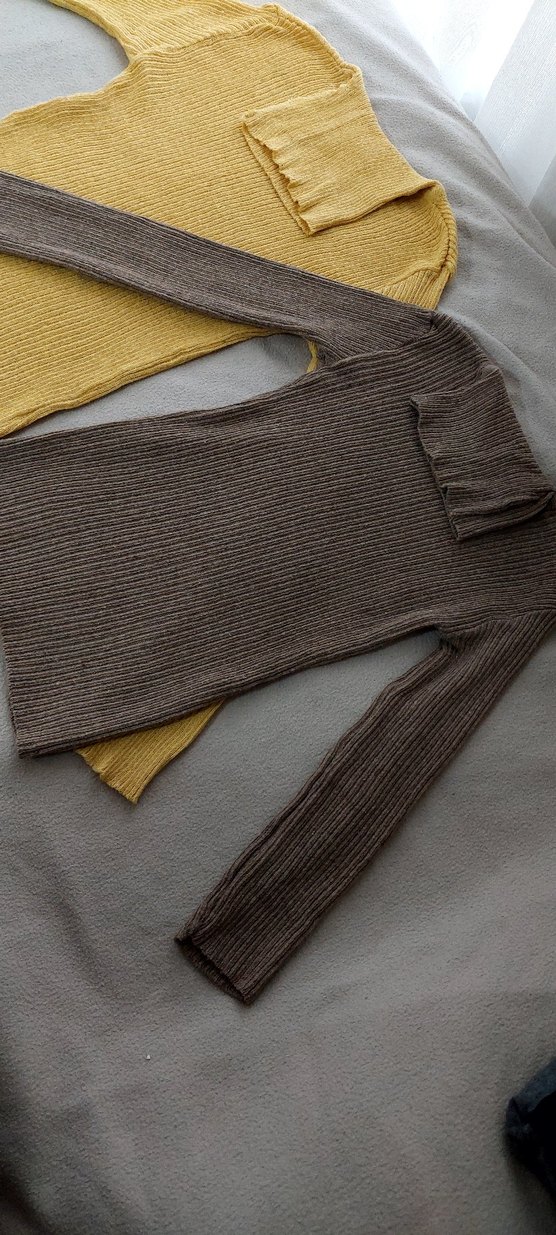 Kahverengi ve hardal boğazlı ve uzun kollu, vücuda oturan örgü kadın kazak. Nerdeyse hiç kullanılmadı