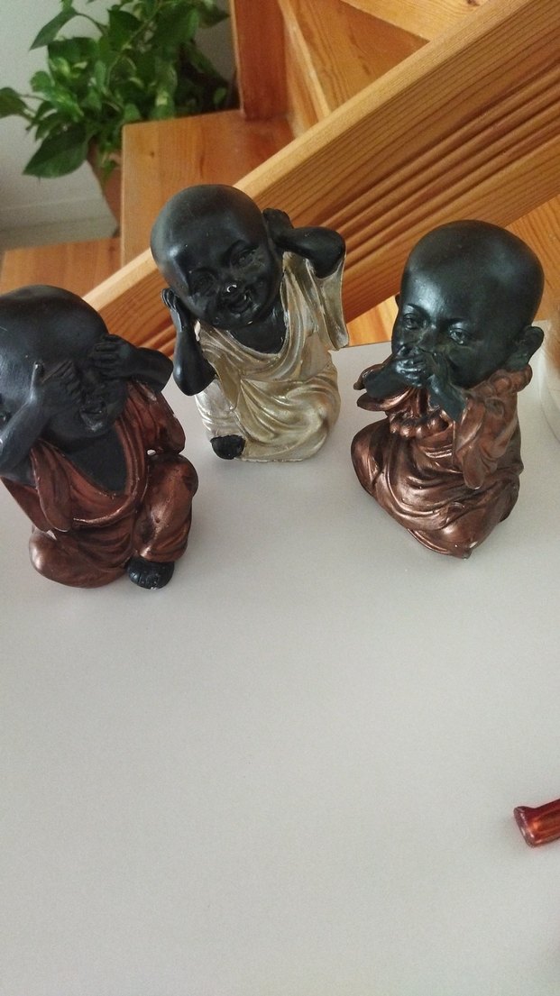 Kahverengi ve koyu renk tonlarında, detaylı ve pürüzsüz yüzeyli üçlü biblo seti. kırık yok sadece hafif renk açılmaları var