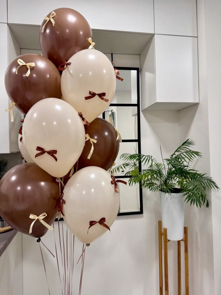 Küçük fiyonklarla süslenmiş açık kahverengi ve krem renkli balon seti, parti süslemeleri için uygundur. Dört kahverengi balon dört krem balon on adet karışık kahverengi krem fiyonk 5 metre beyaz rafya