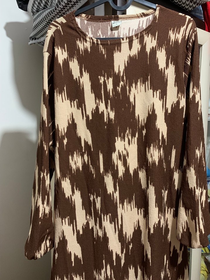 Kahverengi ve kum renkli karışık desenli uzun elbise
