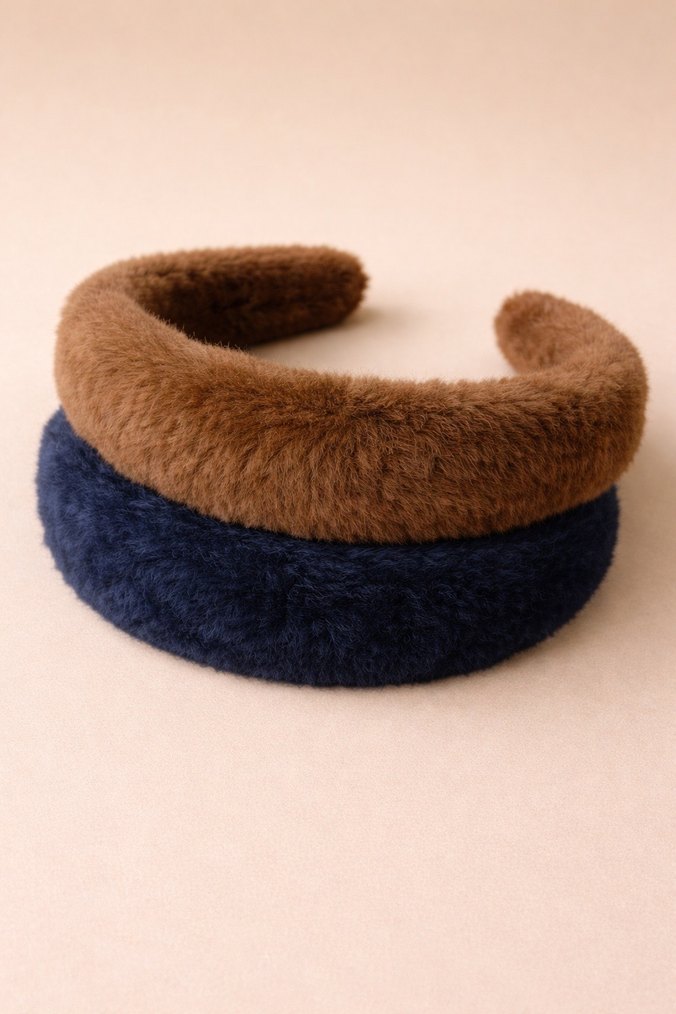 Kahverengi ve lacivert renklerde, yumuşak ve peluş detaylı kumaştan yapılmış, sıcak ve dokulu iki saç bandı seti.