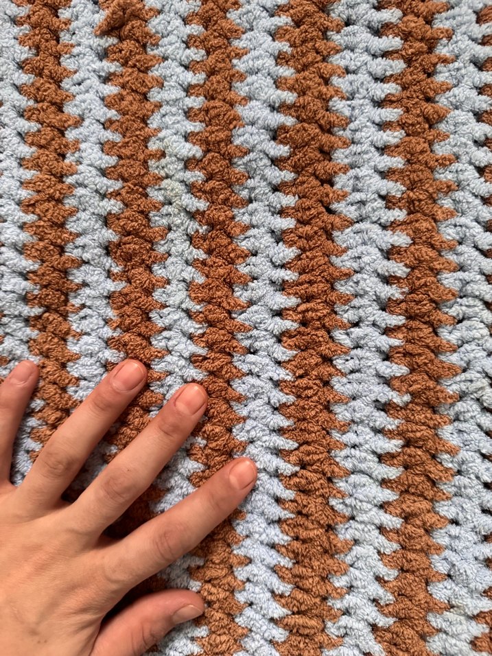 Kahverengi ve mavi çizgili, dokulu yüzeye sahip yumuşak bebek battaniyesi el yapımıdır Rahat kullanım sağlar.