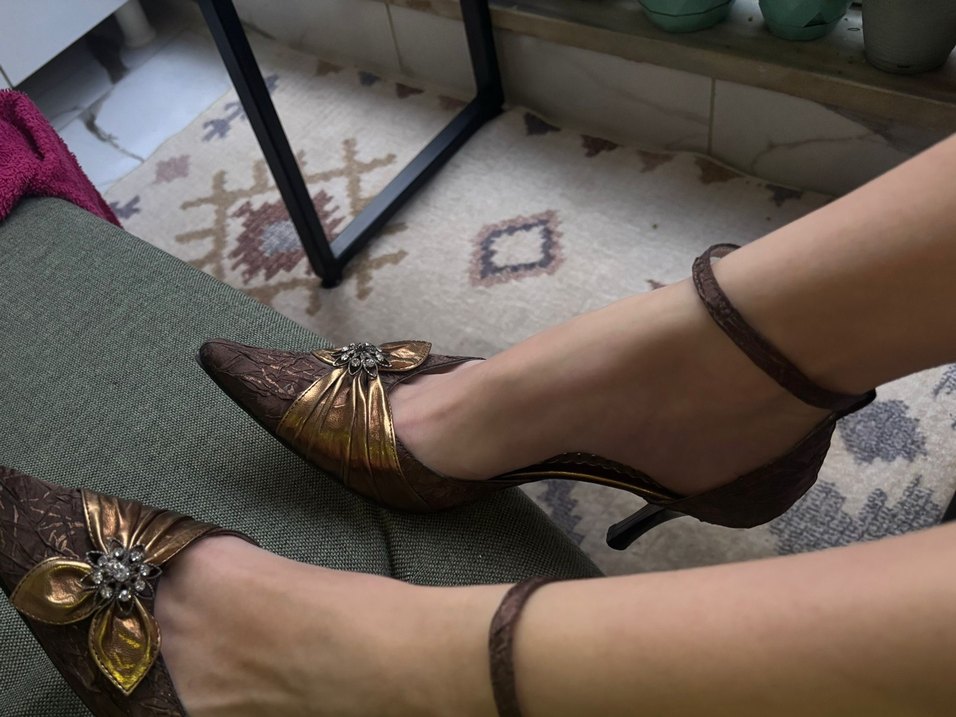 Kahverengi ve parlak altın muhtesem vintage ayakkabı,desenleri kabarık mukemmel,cok severek kullandım ve temiz kullandim,fotograflar yeni cekilmistir, ayakkabı kesinlikle giyilebilir kullanılabilir durumda. dikkat edin solun ortadaki tası var ama sagdakinin ortadaki dusmus, belli olmuyor. tum inditex grubunun kalitesini asan bi ayakkabı ve fiyati bu yuzden kesinlikle uygun
