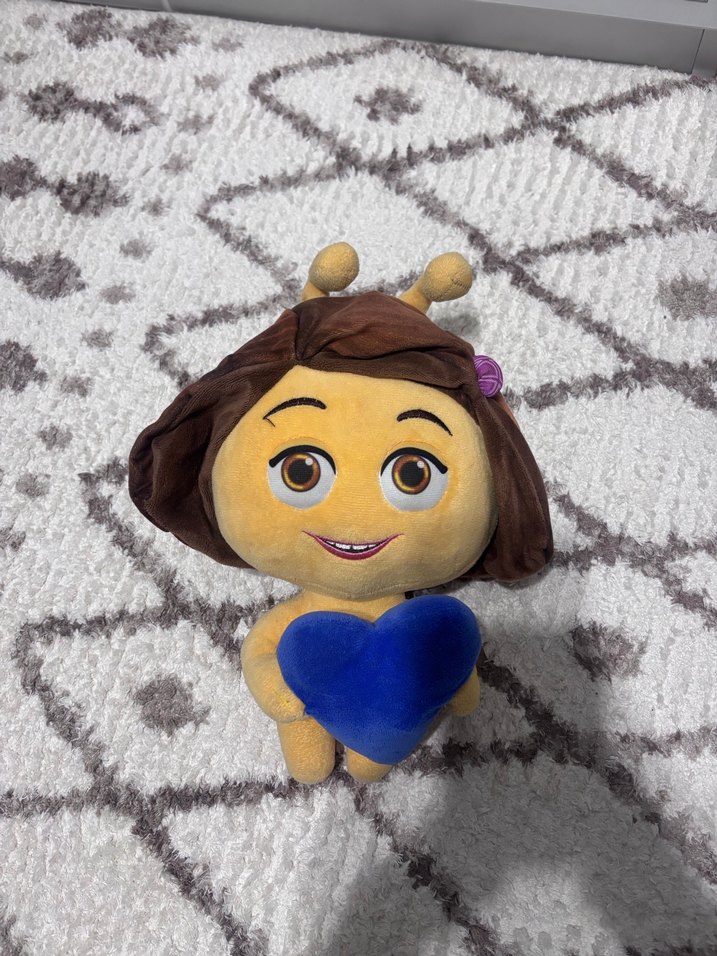 Yumuşak kahverengi peluş oyuncak, canlı mavi bir kalp tutuyor, gülümseyen yüz ve detaylı gözlere sahip.