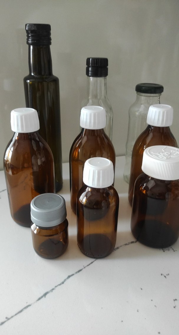Farklı beyaz ve gri kapaklı kahverengi ve şeffaf cam şişe seti.