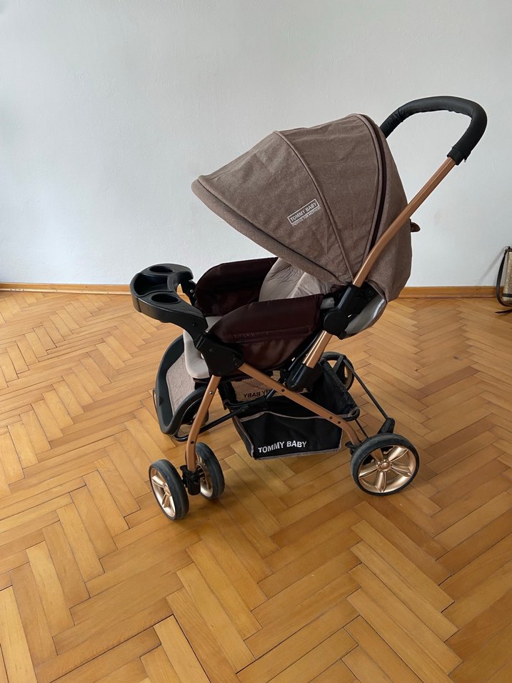 Kahverengi ve gri renkli, tente, bardak tutucu ve alt kısımda sepet bulunan bebek arabası. Rahat pedli oturma alanı ve sağlam tekerleklere sahiptir.