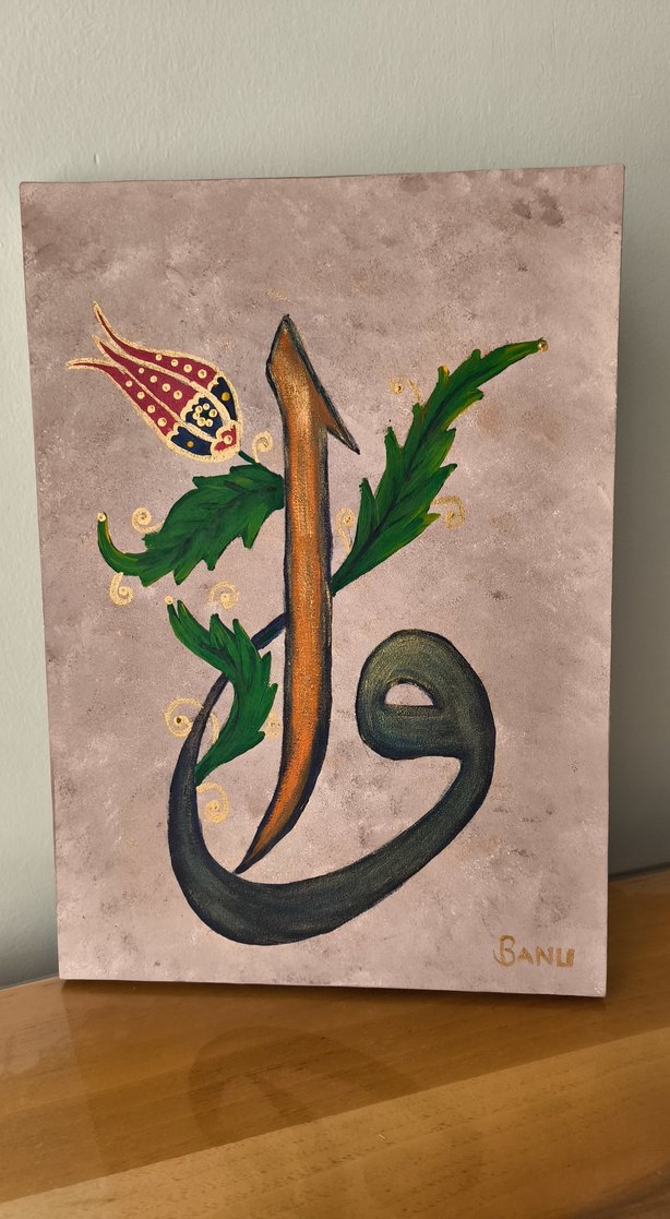 25*35cm orjinal el yazması tablo.Bu tablo, koyu kahverengi tonlarda yeşil bitkisel motifle Dokulu zemin üzerinde kaligrafi ve botanik öğeleri birleştirir.