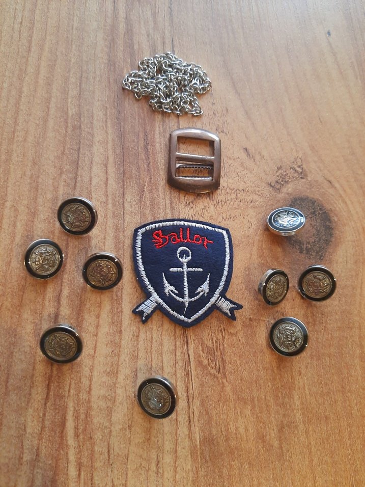 Kahverengi tokalı zincir, denizci rozeti ve çok sayıda pirinç düğmeden oluşan vintage biker tarzı aksesuar seti. ⚓adet fiyatıdır