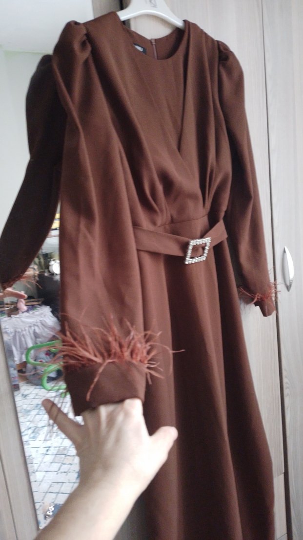 Kahverengi, uzun boy kadın elbise, bol kesim ve tüy detaylı uzun kollara sahiptir. Vintage bohem tarzını yansıtan, kemerli ve desensiz bir modeldir.