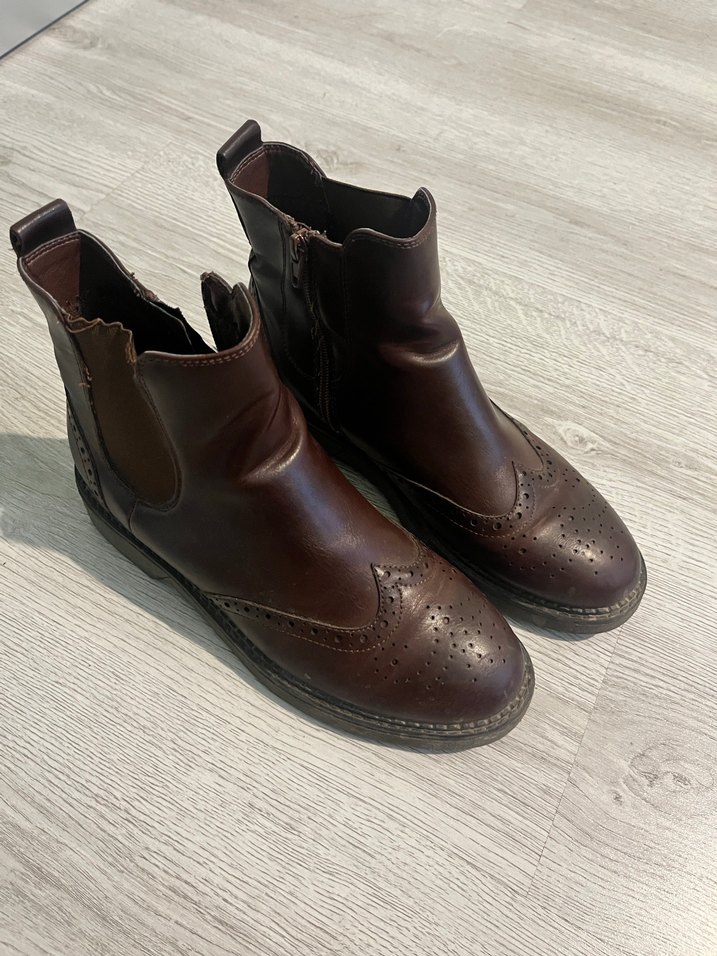 Kahverengi deri kadın botlar, dolgu topuk ve tokalı detaylara sahiptir. Düz, desensiz yüzeyiyle klasik vintage tarzda, günlük kullanıma uygundur.