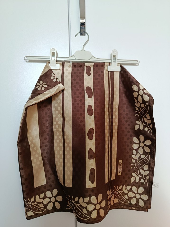 Kahverengi, vintage çiçek ve çizgili desenlere sahip, yumuşak tekstil kumaştan yapılmış drapeli kadın başörtüsü. Bohem ve retro tarzlara uygun.