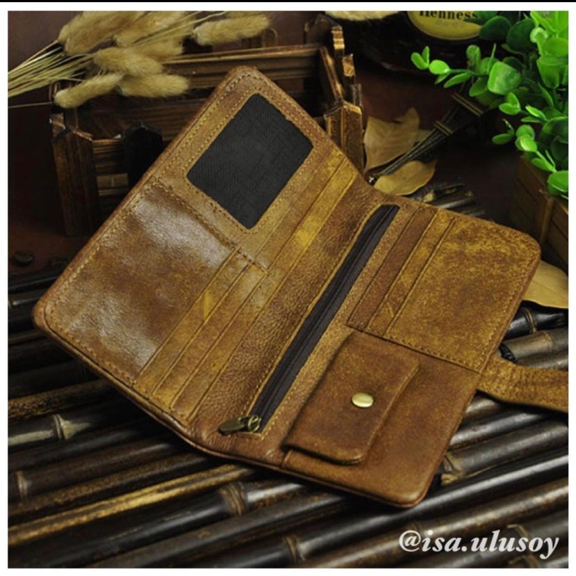 Kahverengi vintage biker tarzı erkek cüzdan, çoklu kart bölmeleri, fermuarlı bozuk para cebi ve düğmeli bölme içerir. Düz yüzeylidir.