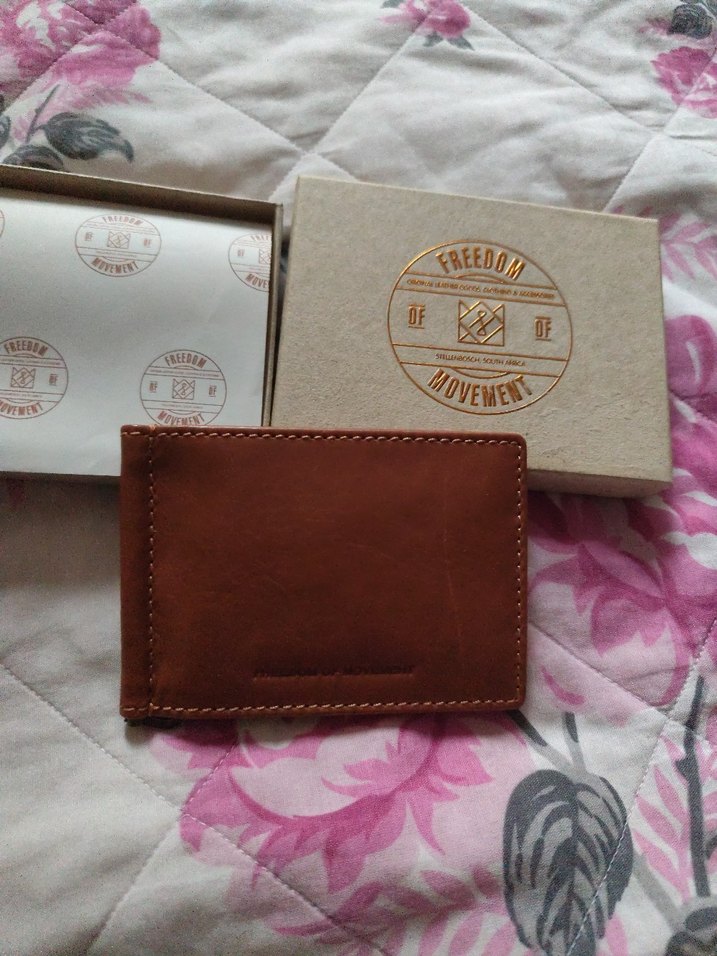 Kahverengi erkek cüzdanı, vintage tarzda pastel desenli baskılarla birlikte. 'Freedom Movement' yazılı kutuda sunulur.