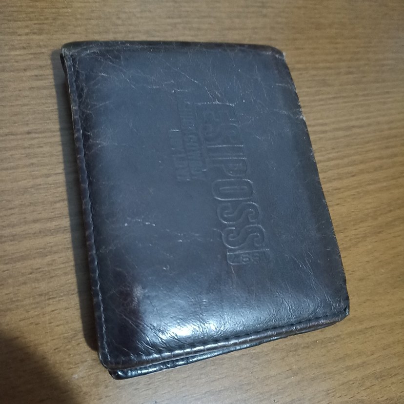 Kahverengi vintage erkek cüzdanı, önünde kabartmalı 'IPOSS' yazısı bulunan düz tasarıma sahiptir. Kullanım izleri retro tarz katıyor.