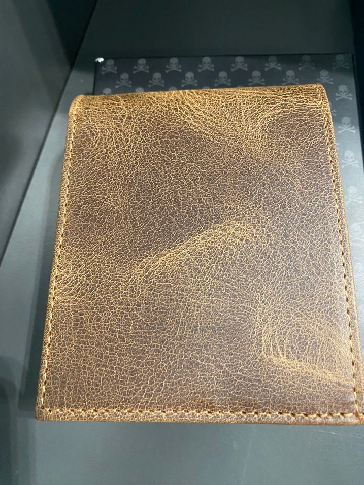 Kahverengi parlak deri kaplamalı, klasik desen içermeyen vintage tarzı erkek cüzdanı. Geleneksel stil sevenler için uygun.