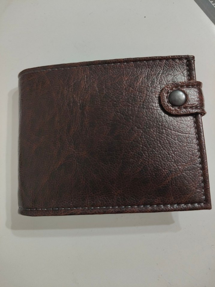 Kahverengi deri, desensiz yüzey ve çıtçıtlı kapama özelliklerine sahip vintage tarzı erkek cüzdanı.