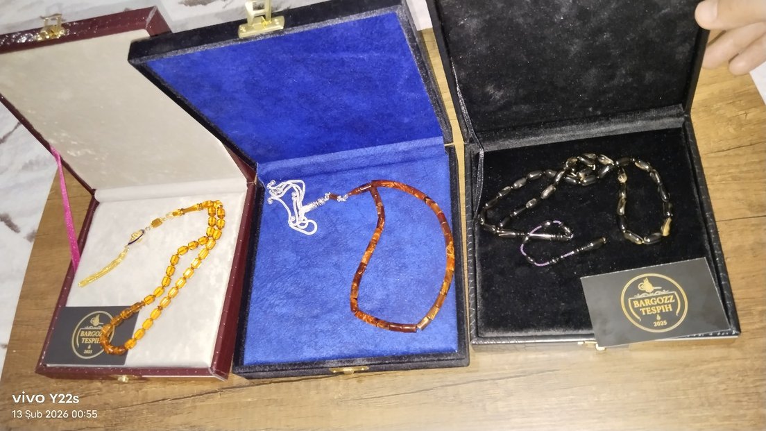 Kahverengi koyu renkli boncuklardan oluşan vintage tarz erkek tesbih, mavi astarlı kutuda sunuluyor. üçünü beraber fiyatı 7.500 TL'dir