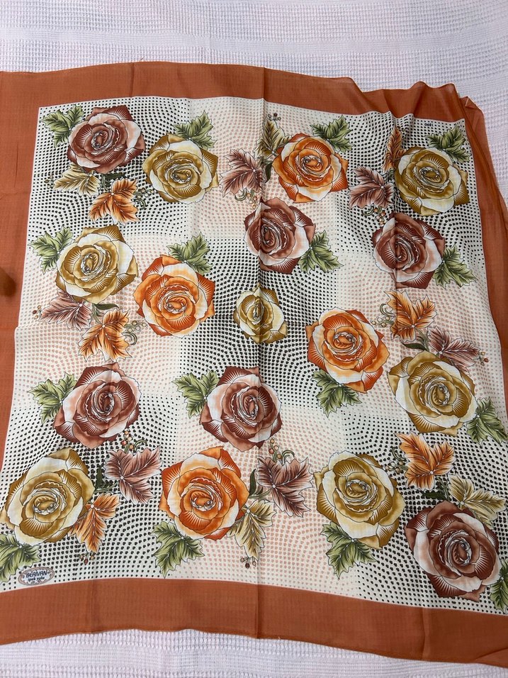 Kadın eşarp, koyu kahverengi renk, fırfırlı detaylar ve vintage çiçek desenine sahip yumuşak sentetik kumaftan yapılmıştır.