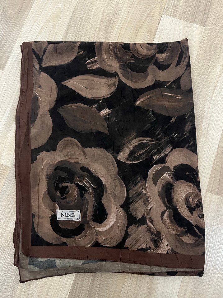 Koyu kahverengi, ipek dokulu, vintage çiçek desenli, drapeli bohem tarzda şal. Üzerinde 'NINE' etiketi bulunur.