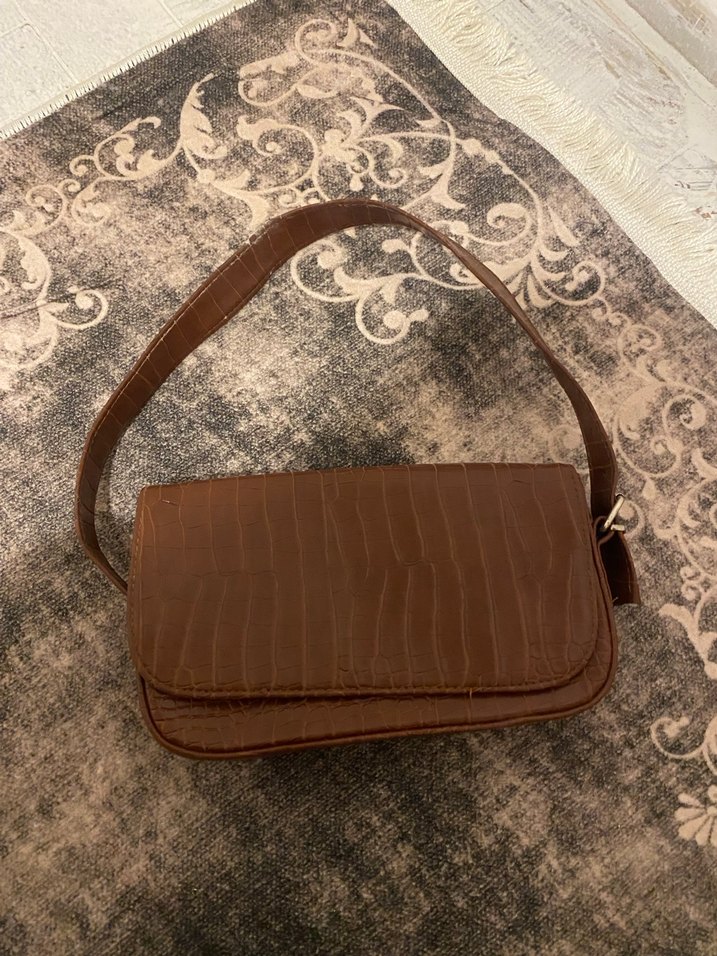 Kahverengi deri, tokalı ve hafif yılan derisi desenli vintage tarzda kadın çantası. Günlük kullanıma uygun, bohem ve retro havası taşıyor.