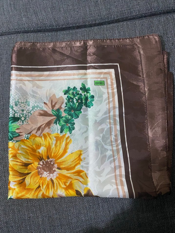 Koyu kahverengi, drapeli vintage çiçek desenli kadın fular. Bohem ve retro tarzı yansıtan yumuşak sentetik kumaş.