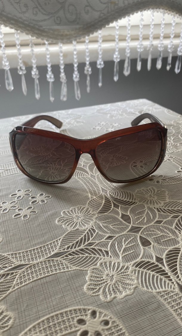 Kahverengi transparan çerçeveli vintage kadın güneş gözlüğü, retro ve bohem tarzda, karşı kültür görünümü için uygun. ️
