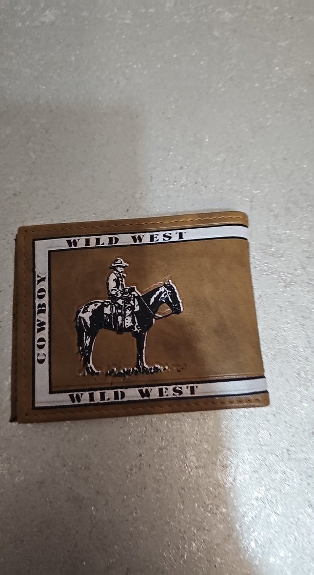 Kahverengi erkek cüzdanı, kovboy ve Wild West yazılı vintage baskılı tasarıma sahiptir, biker tarzını yansıtır.