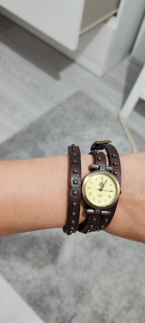 Kahverengi deri kayışlı ve çivili detaylı bileğe dolanabilir kadın kol saati. ⌚