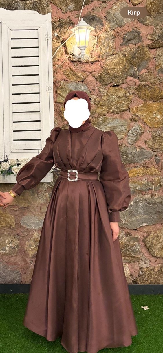 Bir kez giyildi, hiç defosu yok şalıyla beraber gönderim sağlanacak. Kahverengi vintage tarzda, uzun kollu ve yüksek yakalı abiye elbise. Drapeli tasarım ve kemer detayı ile düğünler için uygun.