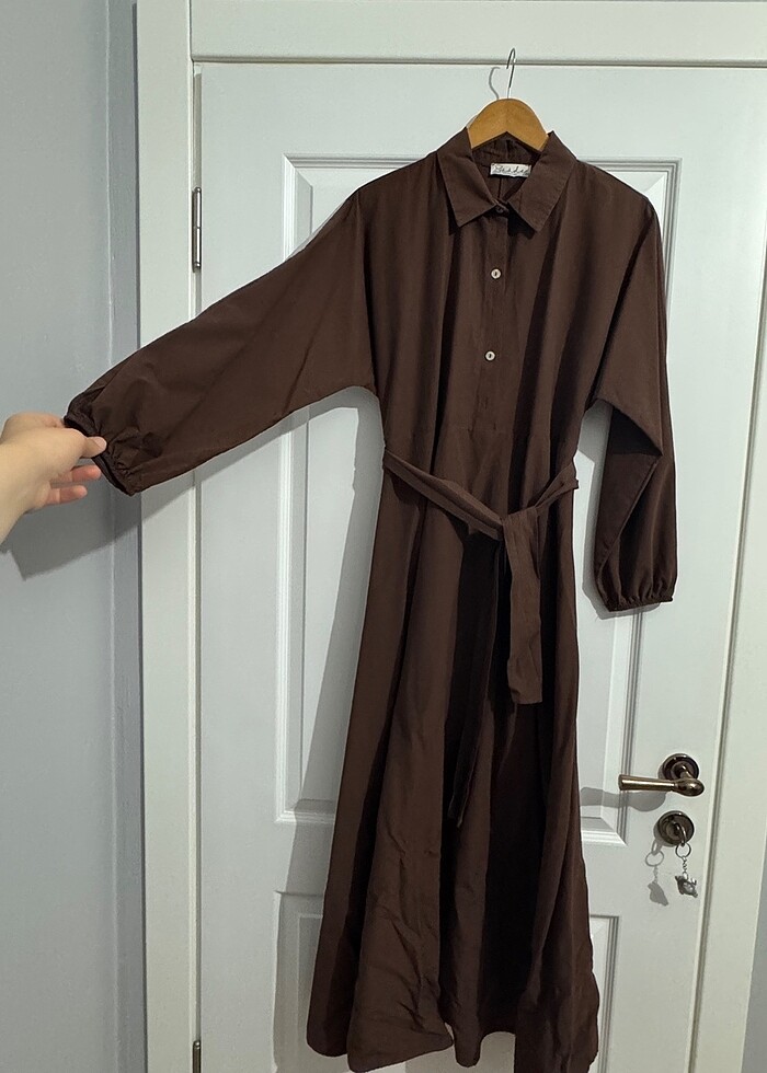 Kahverengi viskon uzun elbise belinden kendinden kemerlidir düğmeleri tam hasarsız az kullanıldı.