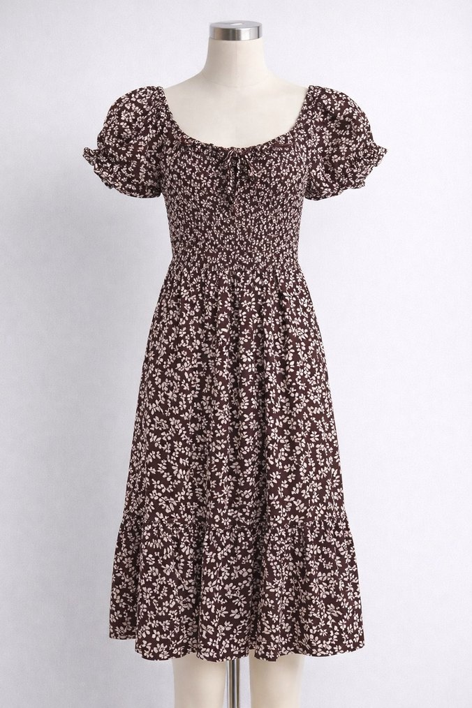 Kahverengi bağlama desenli, kısa volanlı kollu, kayık yaka ve bol kesim midi elbise. Yumuşak sentetik kumaştan, günlük kullanıma uygun.