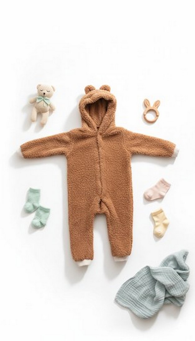 Yumuşak ve sıcak dokulu kahverengi örgü bebek tulumu, kapüşonunda sevimli ayı kulakları bulunur, bebekleri sıcak tutar.