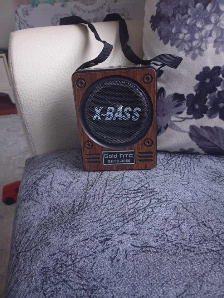 Koyu kahverengi Bluetooth hoparlör, X-BASS ses teknolojisi ve Gold hTC markası ile. Taşınabilir, askılı tasarım. şarj kablosu yok pillede calisiyor