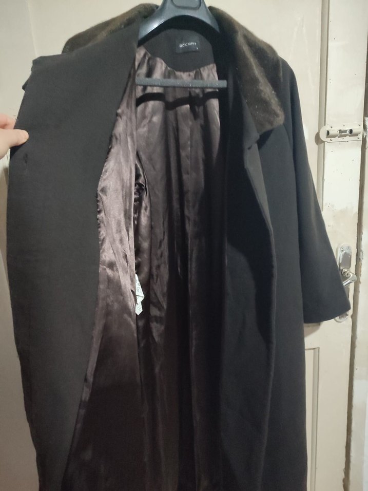 Kahverengi yaka detaylı, içi düzgün astarlı siyah kaban, sıcak tutar ve konfor sağlar. annem geçen sene aldı parkinson hastasi oldu ağır geldiğini söylüyor yoksa çok seviyor canım annem