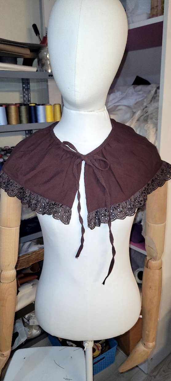 Kahverengi tekstilden, nakışlı fırfır detaylı, yakalı ve kolsuz bolero. Gevşek kesim, gotik tarzda, bağcıklı kapanışlı.