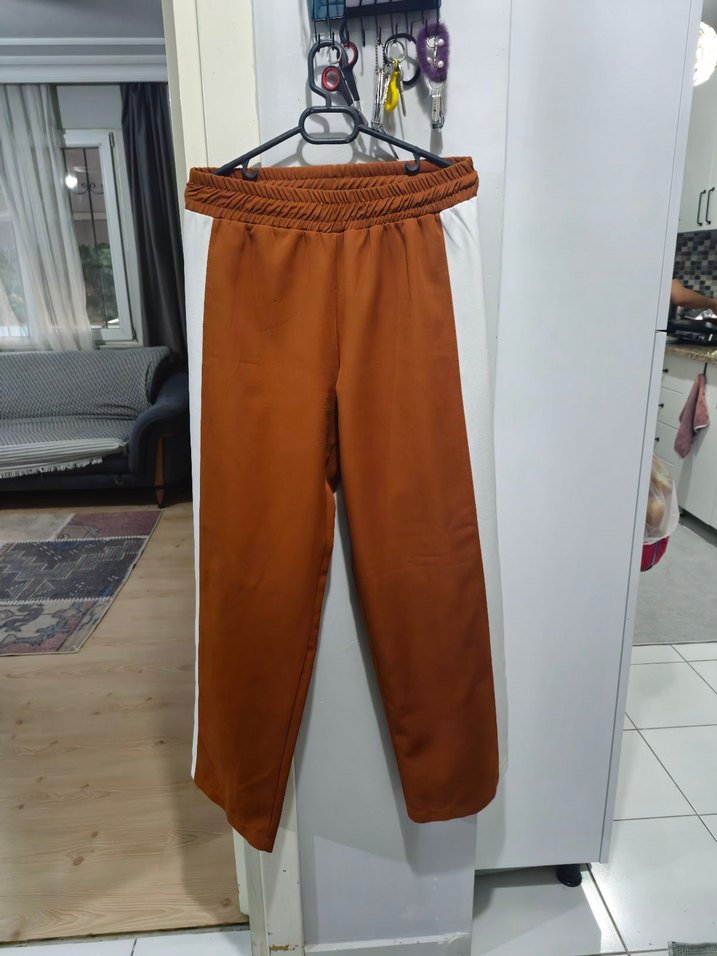 Parlak kahverengi, beyaz yan şeritli kadın midi spor pantolon. Düzenli kesim, yırtmaçlı ve sentetik kumaştan günlük kullanıma uygun. ♀️
