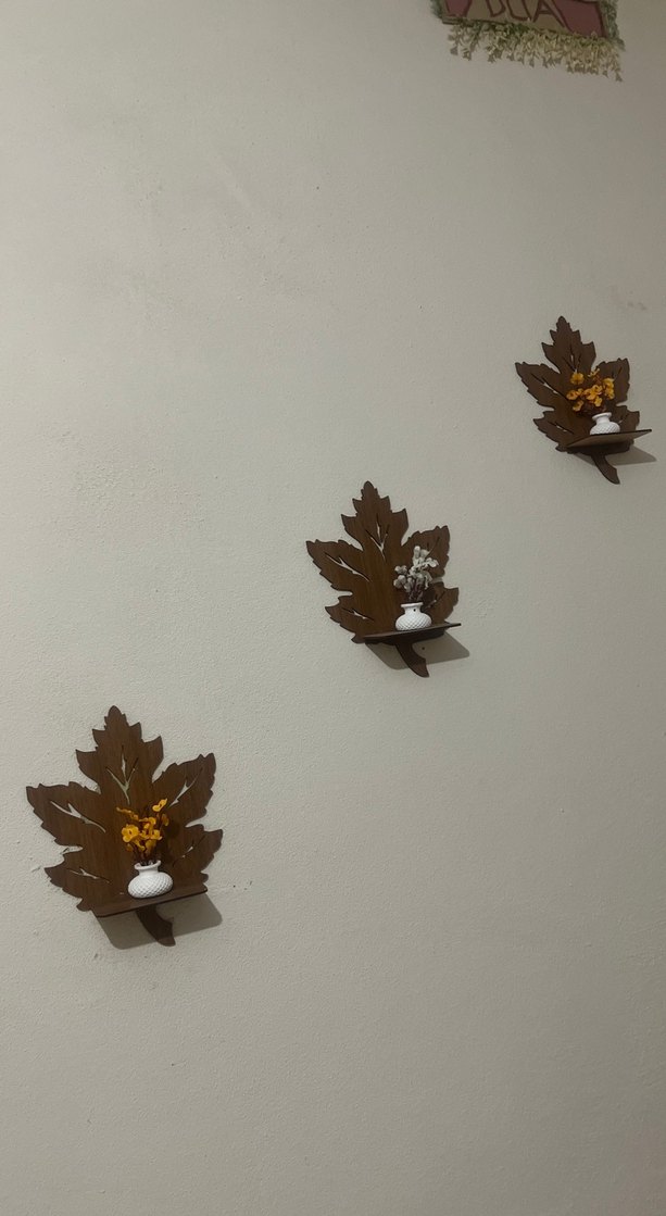 Kahverengi yaprak şeklinde duvar dekorları, küçük beyaz vazolarda renkli kuru çiçeklerle, açık renk duvarda dikey olarak yerleştirilmiştir.