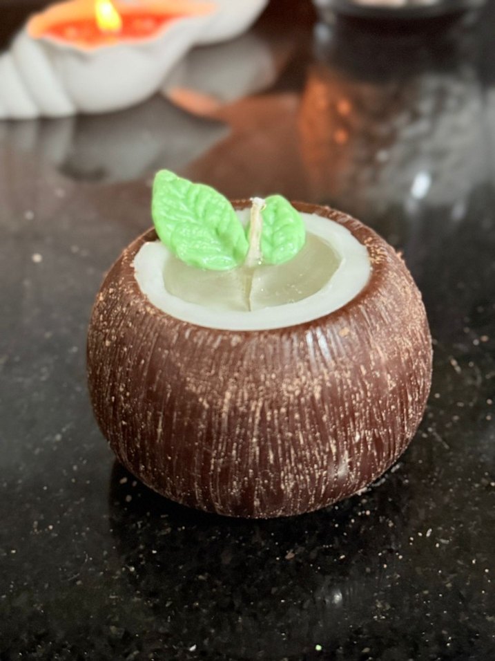 Kahverengi hindistan cevizi şeklinde, üzerinde iki yeşil yaprak bulunan kokulu mum, doğal bir dokunuş sağlar. ️